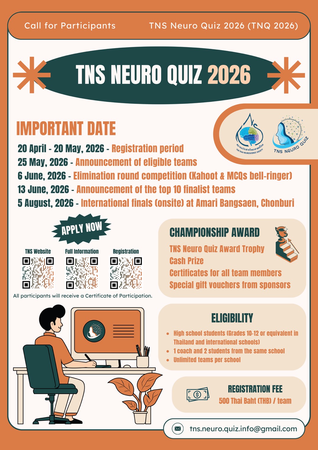 Call for Participation: TNS Neuro Quiz 2026 (TNQ 2026), organized by The Thai Neuroscience Society (TNS), an international academic competition (High school level), Application period: 20 April-20 May, 2026
